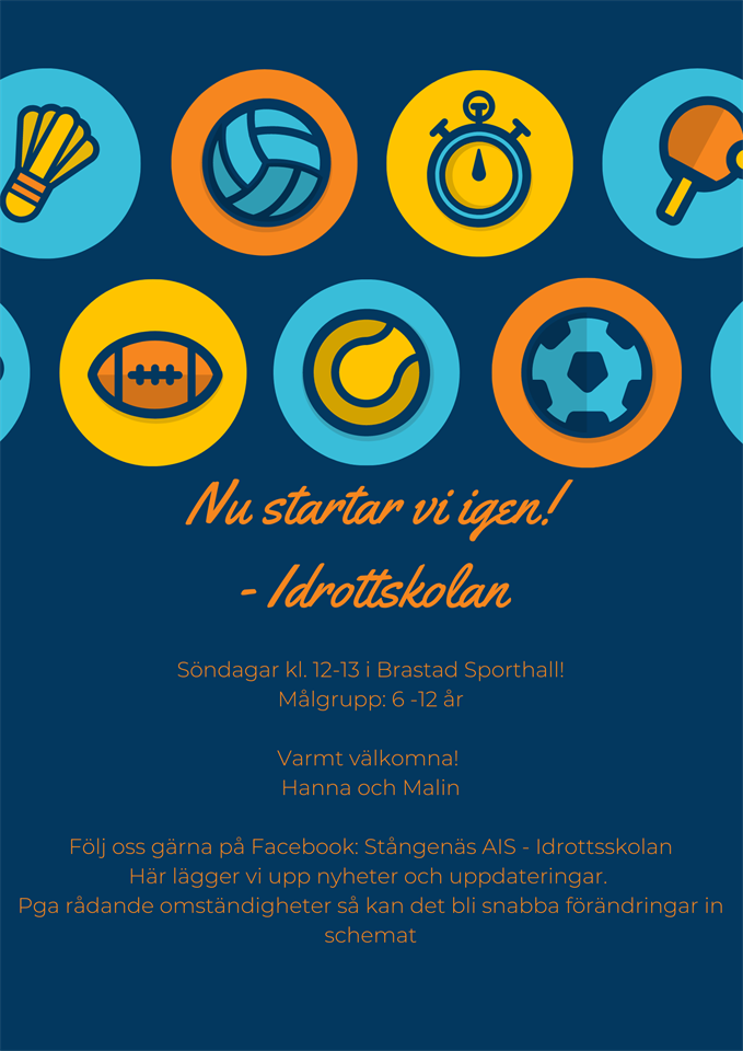 Hejsan! Pga den höga smittspridningen i vårt samhälle och på våra skolor så har vi tagit beslutet att skjuta upp starten på Idrottsskolan. Följ oss här och på Facebook för nyheter och uppdateringar. På Facebook har vi en grupp som heter: Stångenäs AIS - Idrottsskolan. Hoppas att vi snart ses! Malin och Hanna Idrottsskolan 18 jan 2022 3kommentarer