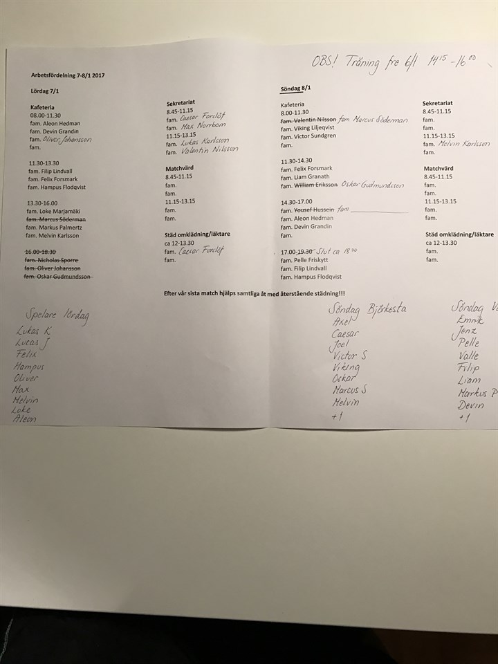 Till helgen som kommer behöver vi verkligen all hjälp vi kan få av er föräldrar. Vi kommer att ha ett gäng som spelar i Björkesta på lördag samt ett hemmasammandrag (Björkesta) och ett borta (Västergård) på söndagen. Jag lägger ut arbetsuppgifterna här så får ni hjälpa mig att fylla luckorna! I kafeteriaschemat har det blivit några ändringar och byten, kontrollera gärna er tid. Sekretariat, matchvärd och städning ska i första hand tillsättas av föräldrar till de barn som spelar på hemmaplan lördag och söndag. Påminner också om att all försäljning av tex fikabröd, frukt mm som vi själva bidragit med går direkt till lagkassan. Tack på förhand!