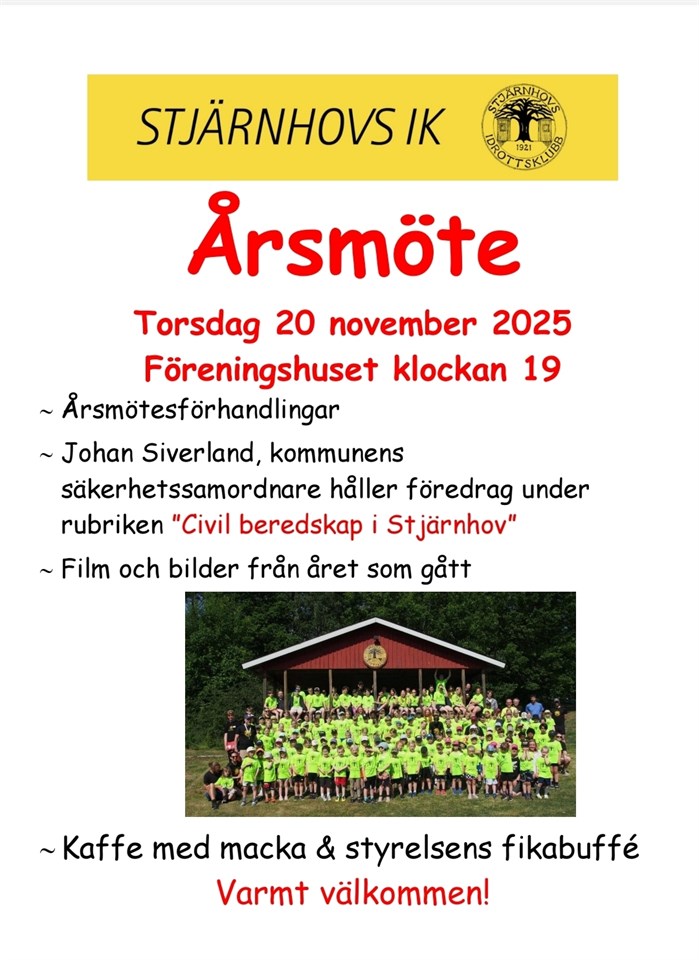 Förutom ordinarie årsmöteshandlingar kommer kommunens säkerhetssamordnare och håller ett föredrag på temat civilberedskap i Stjärnhov.