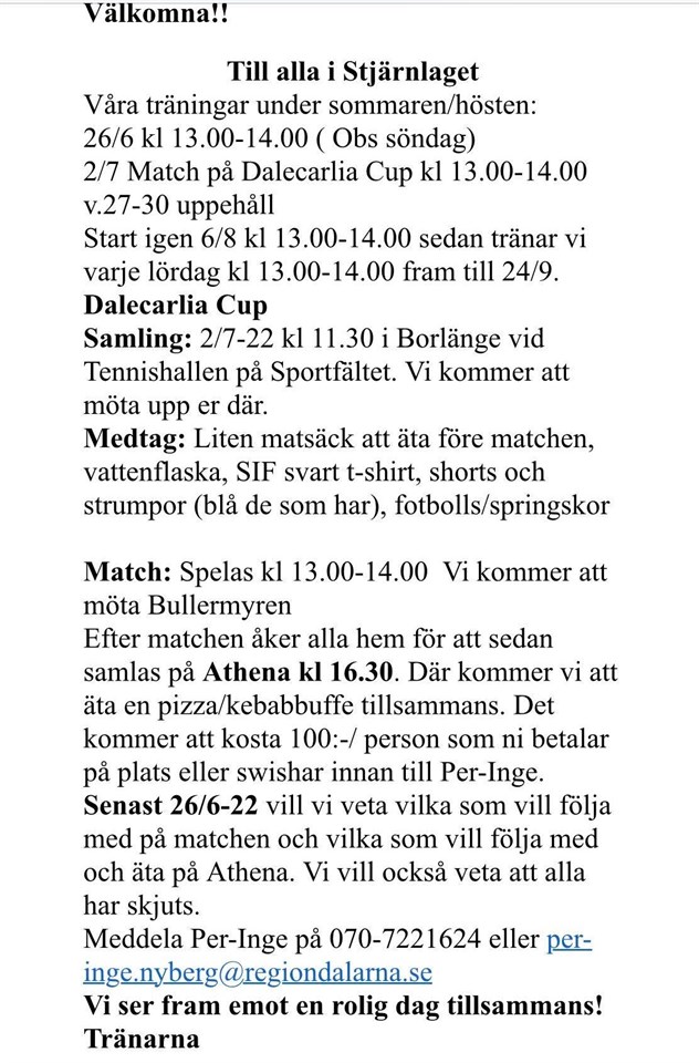 Välkommen till er nya lagsida på laget.se! Den blir central i all kommunikation mellan spelare, ledare, föräldrar och andra intresserade. För att komma igång direkt med en bra kommunikation i och omkring laget finns ett antal viktiga punkter för sidans administratör: • Logga in och lägga till alla spelare och ledare under Medlemmar. • Fylla på kalendern med alla inplanerade aktiviteter. Matcher läggs till via Serier medan träningar och andra aktiviteter läggs till via Aktiviteter. • Skriv nyheter löpande och berätta om verksamheten. I takt med att nya nyheter läggs till kommer den här nyhetstexten att försvinna. Om någon i laget har frågor om laget.se är man alltid välkommen att kontakta vår support på support@laget.se eller 019-15 44 00. Varmt välkomna till laget.se! Stjärnorna 11 jun 2021 0kommentarer