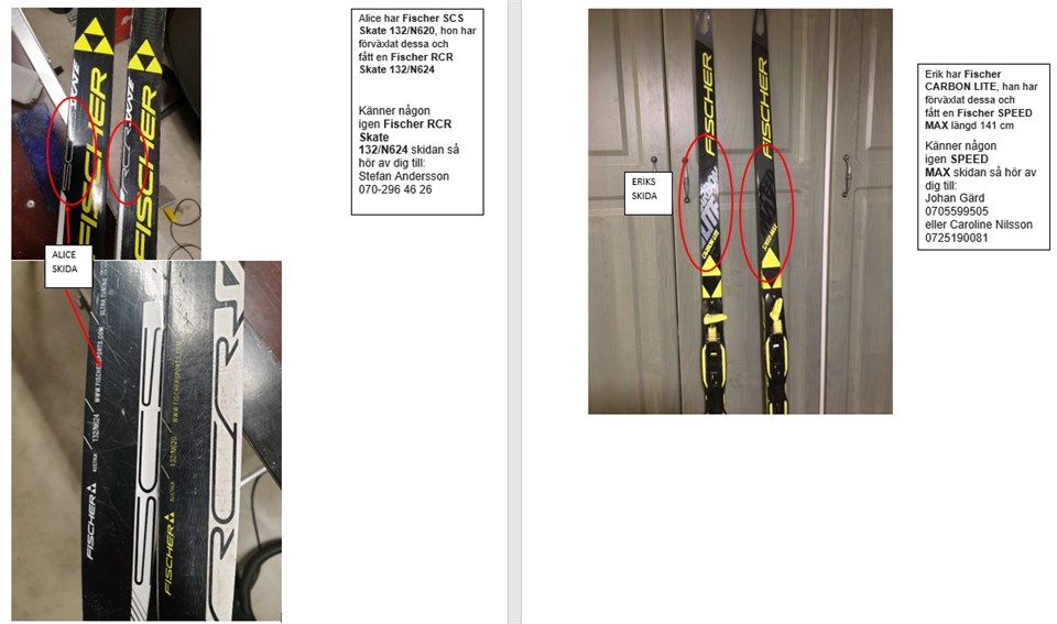 Hej, På senaste tiden har det skett minst två förväxlingar av skidor. Se dokument i denna länk Förväxlade skidor och bild i denna nyhet för att se vad som blivit fel samt kontaktuppgifter för att byta tillbaka. Så kolla igenom era skidor där hemma och se om ni har udda par. Sen uppmanar vi alla att märka skidor och stavar! Mvh, Tränarna Snöskotrarna 20 feb 2021 0kommentarer