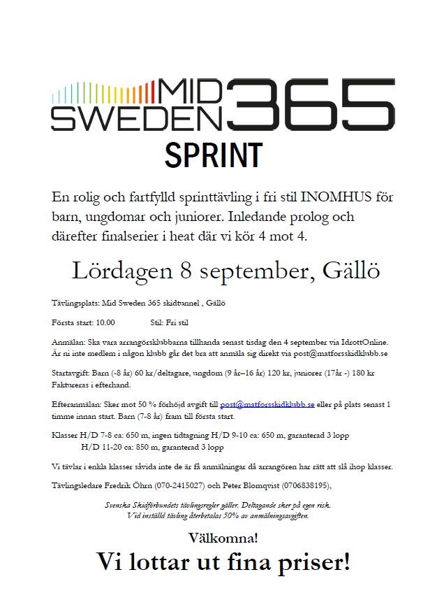 Hej! Se bifogad inbjudan till Gällösprinten. För bättre upplösning se dokument, säsongen 2018-19. Tävlingen är till för barn, ungdomar och juniorer. Ni juniorer, boka in datumet och anmäl er i tävlingkalendern om ni vill tävla. Övriga bered er på ev funktionärsjobb. Mvh/Stefan