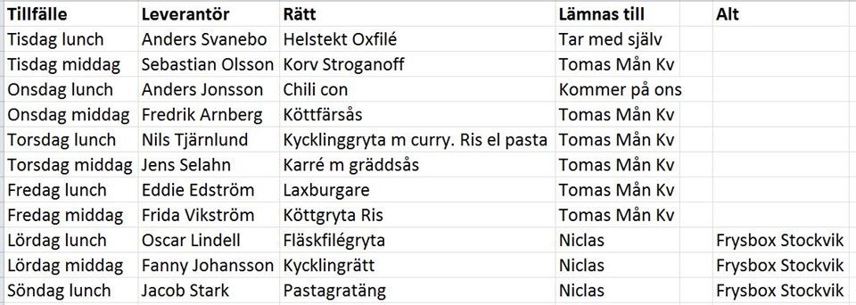 Hej Följande levererar mat till Söderhamn: Frida Wikström Fanny Johansson Jakob Stark Oscar Lindell Fredrik Arnberg Nils Tjärnlund Anders Svanebo Anders Jonsson Eddie Edström Sebastian Olsson Jens Selahn Det är för tillfället 8 st aktiva plus 5-6 ledare som det skall lagas mat till Mat serveras av matlagare (Margareta Svanebo) från tisdag lunch till söndag frukost. Det är bra om ni gör alla maträtter fri från gluten och laktos så att alla kan äta. OBS! inga nötter. Maten levereras fryst och packas helst i plastlådor. (i Boden fanns bara Micro ugnar och då blir det svårt med aluminiumformar). Tack för hjälpen Niclas Senior och Juniorteamet 20 jan 2017 7kommentarer