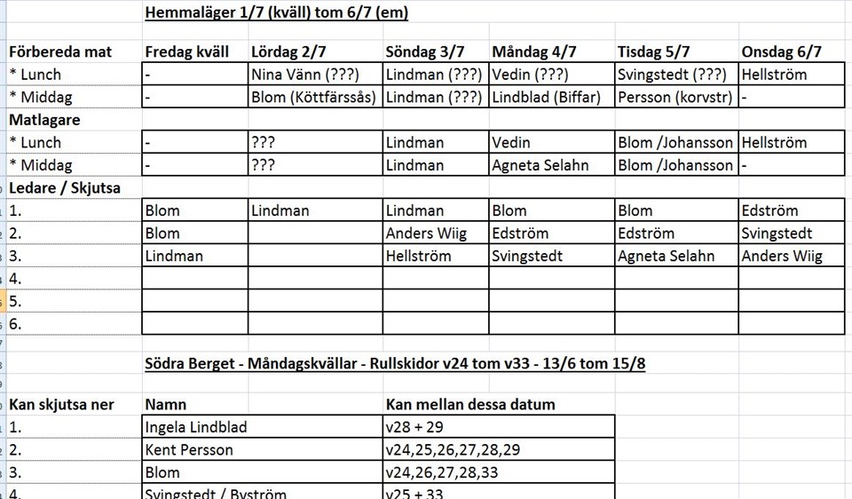 Hej! Nedan info gäller bara lagledare så inget som ni aktiva behöver läsa Det saknas fortfarande några matlagare och ledare till hemmalägret samt några som kan skjutsa på måndagsträningarna. Titta igenom den bifogade bilden och anmäl er här via kommentarer. Jag kommer sedan kontinuerligt att uppdatera bilden och lägga upp den på nytt. Hemmalägret 1/7 tom 6/7 Dan Lindman är huvudtränare fredag t o m söndag. Tomas Edström måndag t o m onsdag. Träningsprogram är under framtagande och kommer snart att läggas ut på laget. När det är gjort kan vi detaljplanera skjutsningar mm. Karin Svingstedt, du sa att du och Stefan kunde under veckan. Vilka dagar var det? Måndagsträningar Här behövs det skjuts ner från Södra Berget till LV 5. Det är 7 anmälda till imorgon så det borde räcka med två bilar. Mvh/Stefan