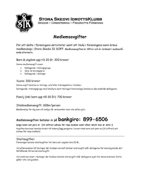 medlemskap i Stora Skedvi IK SOFF. Medlemsavgiften är 100 kr och är inräknat i nedanstå-