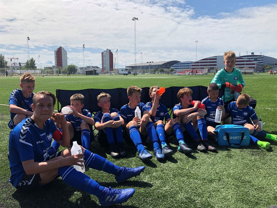 Idag var det bortamach på Rosvalla i Nyköping för att möta stadens IFK. Det var väldigt varmt i idag... 27 grader, stekande sol och en konstgräsplan som reflekterade tillbaks värmen.. Tur att det fanns en liten vindbris från havet i allafall.. Domaren bestämde att vi skulle ta extra vattenpauser mitt i perioderna vilket var ett mycket bra beslut! Bilden är från en sådan. Tränarna hade dagen till ära lite förändringar i spelsystemet som säkert var lite förvirrande i starten, men det såg bättre och bättre ut ju längre matchen gick. Vi har ledningen 1-2 efter första, 2-3 efter andra och med slutresultat 4-4. Mycket bra krigat och kämpat idag killar!! Värmen var nästintill outhärdlig till och med för oss som stod still och tittade på... Målen idag görs av Albin*2, Brian och Linus. Assistkungen blev Anton med 3 framspelningar. 16" 0-1 Albin får en djupledsboll från Anton och avslutar säkert i mål 25" 1-2 Albin spelar fram Anton i djupled på vänsterkanten som rycker loss och slår ett fin inlägg längs marken mitt in i planen till friställd Brian som avslutar prickfritt vid stolproten 44" 2-3 Djupledsboll på Anton på vänsterkanten som hittar Albin snett inått bakåt, som efter en dragning placerar bollen i mål. 61" 3-4 Linus snappar upp en boll i straffområdet och krigar in den i buren Med facit i hand känns oavgjort som ett rättvist resultat. Vi hade ledningen flertalet gånger men ett IFK som kämpar sig tillbaka målmässigt hela tiden. Och egentligen skall vi nog vara väldigt nöjda med poängen. IFK radade upp ett antal chanser för 5-4 sista 5 minutrarna. Tack till kämparandan och svettdropparna idag killar. Tack till IFK för en trevlig match. Tack till våra supporters, tillika föräldrar och chaufförer :) Nu laddar vi för hemmamatch på onsdag mot Södra!