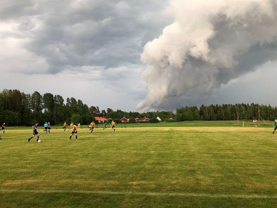 Ikväll var det dags att ta emot Eskilstuna Södra hemma på Hammargärdet. Det var lite tryckande och kvav värme på eftermiddagen. Väderprognosen visade åskoväder senare till kvällen, men förhoppningsvis skulle vi hinna spela klart matchen... Det han vi inte...Under våra 6 år var detta nog bland det värsta vi varit med om i väderväg. Södra startar med full fart och entusiasm och har 0-3 på oss när dommaren avbryter matchen.. Blixtarna ligger nu alldeles för nära och närmsta nedslag är bara någon km bort. Märklig situation med båda lagen, ledare och domare flyendes upp till klubblokalens uteplats. Publiken flyr till sina bilar. Där blir vi sittandes i ca 30 minuter innan det värsta dragit över och vi kommer ut på plan igen. Men då börjar ösregnet istället som pågår i princip hela resten av matchen.. Men när vi är igång igen är vi betydligt bättre på tårna och får till ganska skapligt spel stundtals. Betydligt bättre än inledningen. Vi har dock en tendens att släppa bollen aningens sent och då blir det svårt med motståndare som är snabbt på. Södra killarna är stora och spelar fysiskt och ger inte bort något gratis. Andra perioden slutar 1-2 till Södra och sista 0-3, dvs totalt 1-8. Lite väl stora siffror med tanke på hur matchen ser ut spelmässigt. Södra straffar oss hårt när det blir spelvändningar högt i plan och de kommer i full fart och bredd och vi inte hinner med alla gånger. Några gånger tillåter vi de också få ha boll under kontroll utan för straffområdet där de tackar och stänker dit bollen. Vi har som sagt bra spel stundtals och målet är en fin spelvändning med Linus som rycker sig loss på högerkanten spelar in bakom en försvarare till Anton som kommer på djupet och sätter dit den via målisen som är på men inte orkar tippa ut bollen. Vi har några till fina chanser till i med skott i stolpen, ett offside mål och några fina långskott som Södra kepern plockar/blockar effektivt. Något mål till på kontot hade känts rättvist. Svåra förhållanden idag och inte en torr fläck någonstans. Men Bra kämpat killar!! Nu tar vi midsommar vila och laddar för sista fotbollsveckan innan sommaruppehållet. Tack till våra föräldrar som hjälpte till idag :) Ledarna