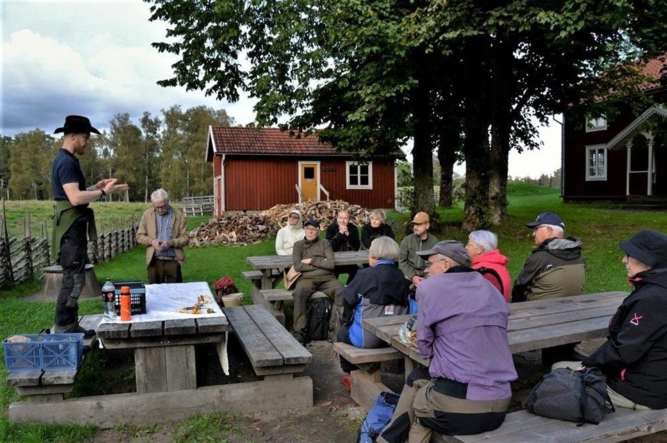 Svampexkursion på Lövö 2023-09-13 Denna regniga sommar har ändå något gott med sig - det är väldigt gott svamp i skogarna. Det gjorde att denna kväll blev lyckosam och även vädret var varmt och ganska soligt. En och annan mygga var dock ute och letade efter någon att sticka av de 14 deltagarna. Vi hade bjudit in Anders Strand, som är en kunnig svampkännare och som studerat mykologi, läran om svampar. Vi har runt 15 000 svamparter, om vi räknar med alla inklusive mögelsvampar och liknande, men ikväll skulle vi lära oss om de svampar som vi kan hitta ovan jord – vilket är nog så svårt. Efter en kort introduktion för kvällen begav vi oss ut i skogen väster om Lövö. Vi fick en timme på oss att plocka så många svampar vi kunde hitta. Åter vid platsen med bänkarna framför Lövö gick vi igenom var och ens skörd av svampar. Anders berättade kunnigt och inspirerande om varje svamp och sorterade dem i högar på det vita lakanet. Det blev många högar med bl.a. kremlor, riskor, musseroner, soppar, flugsvampar, kantareller, röksvampar, fjällskivlingar. Alla svampar kan man, som bekant, äta en gång men för att vara helt säker ska man inte plocka vita svampar med vita undersidor och bruna svampar med bruna undersidor - men då missar man också många goda matsvampar. Man ska dock vara hundraprocentigt säker vilken svampart det är innan man tar hem en svamp. Man ska köpa de senaste svampböckerna då de har korrekt information om våra svampar. De gamla böckerna kan ge felaktig information, vilken kan bli farligt, sa Anders. Det började skymma och vi fikade medan Anders summerade vilka svampgrupper och svampar vi hade plockat, vilket var en bit över 40 arter. Egert avtackade Anders för en intressant och givande kväll i svamparnas värld med en kåsa med föreningens logotype präglad i läder förutom en ersättning som kassören, Elisabeth, senare kommer att betala till Anders. Det var en lärorik och skön kväll och alla åkte nog hem och tyckte att hösten kan vara underbar även om det skymmer redan innan kl. 20. Bilder Text: Egert Fransson Bilderna 1, 3 och 5 är fotograferade av Jan Ekman, resten är fotograferade av Egert Fransson.