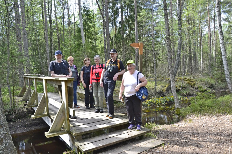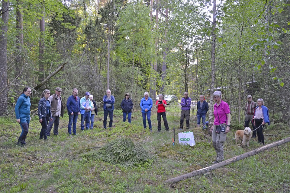 Vandring Kävsjön runt Precis som förra våren blev vi 7 personer som samlades på Naturums parkering för att genomföra vår årliga vandring Kävsjön runt. Då vädret lovade högre temperaturer framåt dagen så beslutade vi att gå i vänstervarv för att slippa gå på det nyklippta gungflyet i eftermiddagshettan. Vi hade bara hunnit en liten bit ut på gungflyet när vi hörde morgonens första gök. Väl inne i skogen träffade vi vårens första mygg som dock visade sig vara av den ”snälla” sorten som inte gav några bestående men, dvs myggbett. Efter drygt halva vandringen kom vi då fram till S. Svänö där det ju passar bra med en lite längre paus med korvgrillning, förtäring av medhavd proviant och ett par koppar kaffe. Efter att ha fyllt vattenflaskorna ur den fina brunnspumpen så drog vi vidare i lugnt tempo mot parkeringen vid Naturum. Väl framme konstaterade vi att dagen bjudit på en jättefin vandring i perfekt väder. En Spillkråkas högljudande trummande blev väl det mest bestående minnet av fågellivet under vandringen men även ett flertal gökar hördes från alla väderstreck. Vi hörde även tranor, koltrast, taltrast, enkelbeckasin, bofink, större hackspett, ärtsångare, buskskvätta, lövsångare mfl Text o bild: Elisabeth och Jan Bilder