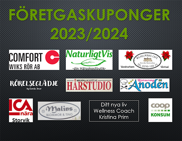För 23:e året i rad så säljer vi företagskuponger i sammarbete med lokala företag i och omkring Storvik. Rabattkuponger på Wiiks Rör, Restaurang Anoden, Coop Konsum, Ica, Hårstudion Helena & Lotta, Malins blommor & Ting, Rörelseglädje by Carola Snar, Ditt nya Liv - WellnessCoach Kristina Prim, Naturligtvis Hälsokost i Sandviken samt Wilhelminas Café!