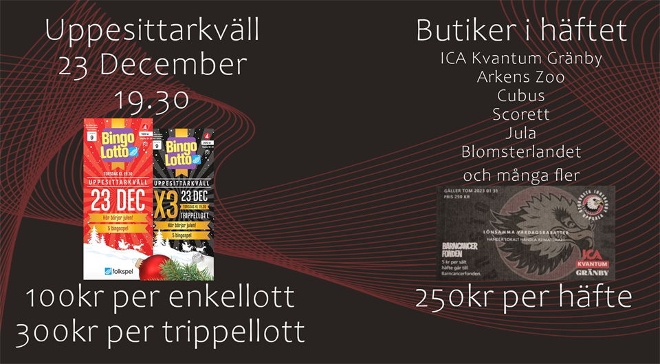 Rabatthäfte Storvreta IBK lanserar i år ett rabatthäfte som alla lag i föreningen ska sälja. Vi uppmuntrar er till att sälja 2 stycken vardera. Priset för ett häfte är 250 kr. Vad är ett rabatthäfte? Ett rabatthäfte har kuponger i sig med erbjudanden på olika butiker. Det kan till exempel vara “Gratis popcorn vid köp av biobiljett” på en biograf, eller “Köp 3 betala för 2” på specifika produkter. Bingolotter Vi ska även dra igång med att sälja Bingolotter till uppesittarkvällen den 23 December. Det finns två olika typer av lotter, enkellott för 100 kr och trippellott för 300 kr. Vi ser därför gärna att alla som har möjlighet att sälja lotter säljer så många man kan. Vårt mål är att alla säljer minst 10 stycken lotter vardera gärna flera. Tips! Hör med kollegor, grannar, familj , bekanta om dem är intresserade utav att köpa. Det kommer även finnas utskrivna lappar som ni kan lägga i fikarummet som personer kan skriva upp intresse för(tränarna har med sig dessa). Beställning, Hämtning och betalning Ni går tillväga på så sätt att ni kollar upp hur många häften och bingolotter ni har möjlighet att sälja. Därefter beställer ni här genom att skriva i kommentarsfältet hur många man kan sälja, så har tränarna med sig detta på nästa träning. Det går att beställa flera gånger. Sista dag för utlämning är 16 december Betalning sker i samband med eller innan uthämtning av häftena och lotterna. På dessa sätt kan ni betala: Swish till en tränare Kontant betalning till en tränare (jämna pengar endast, vi kan inte växla) Inbetalning på PG 836 5549-8 Om ni har några frågor kan ni ställa dem här i kommentarsfältet, fråga kring en träning eller maila era frågor till ornarna@storvretaibk.se Lycka till!