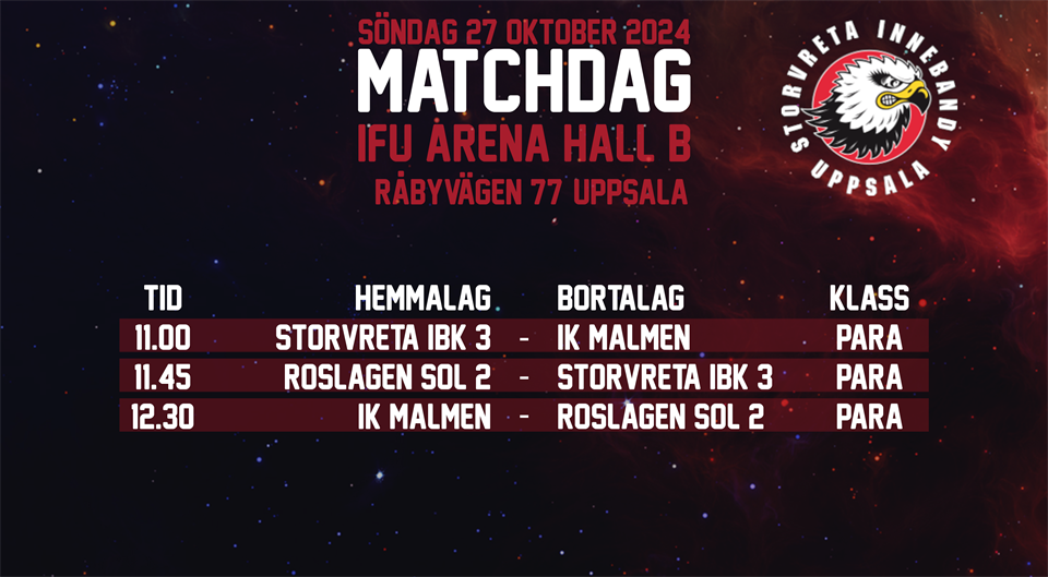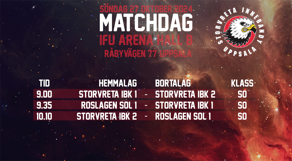 Tjena bästa gänget! Nu börjar det dra ihop sig för vårat första sammandrag för säsongen. Nu på söndag 27/10 är det äntligen dags för matchspel. Här nedan kommer lite information om vad som kommer att hända under dagen för Röda Laget. Samling & tider för Röda Laget: Storvreta IBK 1 (Röd) Jocke F (Mv) Eddie Bengt Jossan Musse Joel Fredrik Storvreta IBK 2 (Röd) Jakob GO Marcus Sebastian Karolina Theo Andreas Robert Samlingstid: 08:30 vid receptionen. Ta med: Inneskor, Innebandyklubba, vattenflaska och glasögon, Matchtröjor kommer ni att få låna från oss tränare under dagen. Spelprogramunder dagen: 09.00 Storvreta IBK 1 - Storvreta IBK 2 IFU Arena, hall B 09.35 Roslagen SOL 1 - Storvreta IBK 1 IFU Arena, hall B 10.10 Storvreta IBK 2 - Roslagen SOL 1 IFU Arena, hall B Efter sista matchen är dagen slut för Röda gruppen, men ni kan vara kvar om ni vill och kolla på när Svarta gruppen spelar.