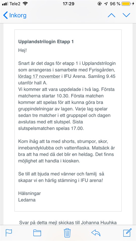 Matcherna i Gävle är något försenade, därför kommer vi senare än planerat till Uppsala. Om du behöver veta närmare tid, skicka ett meddelande till 076-2390774 Hälsningar Ledarna SIBK Örnarna 11 nov 2018 0kommentarer
