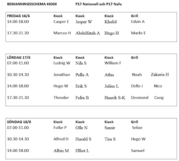 bifogat finns ett bemanningsschema för Hudik cup. I schemat står spelarnas namn, men då de dömer matcher hela helgen så är det vårdnadshavarna som bemannar passen. Önskar man byta pass med varanda är det såklart okej, men meddela lagledarna så vi kan hålla schemat aktuellt.