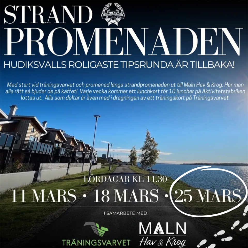 Snart är det helg igen och på lördag väntar den sista Strandpromenaden! Kom nu till Strandpromenaden på lördag och gå tipsrunda till Maln hav & krog. Om man har alla rätt bjuder de Maln hav & krog på kaffe! Passa även på att äta lunch på Maln, eller bara en paus med något gott att dricka! Om man inte vill gå tillbaka så går stadsbussarna en gång i timmen Tidtabell stadsbuss 4 Bland de kuponger som har flest rätt så lottas varje vecka ett förstapris ut i form av ett lunchkort på Aktivitetsfabriken för 10 luncher. Förra lödagens vinnare var Yvonne Björk! Vinnaren är kontaktad Alla som deltar under dessa 3 lördagar är med i dragningen av ett träningskort från Träningsvarvet(värde 2400kr). Vi från Strands IF handboll kommer att stå och sälja svarsformulären vid start, (träningsvarvet) som kostar 50 kronor. Pengarna går oavkortat till Strands handboll. Vi är väldigt glada att ha fått till detta event med kort varsel och hoppas att ni är flera som vill förena nytta med nöje tillsammans med oss! Välkomna NU på lördag! Observera! Start- och sluttiden, 11.30-13.30