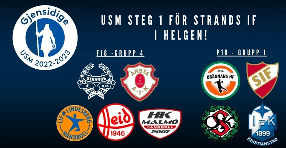 USM steg 1 börjar imorgon lördag för både F18 och P18! F18, spelare födda 04/05 åker till Årsta för att spela fyra tuffa matcher i helgen. Lördag 24/5 - Sjöstadshallen 13:50 Strands IF - BK Heid resultat 7-14 17:50 HK Malmö - Strands IF resultat 33-8 Söndag 25/5 Sjöstadshallen 12:10 Strands IF - LIF Lindesberg resultat 14-27 14:50 Årsta AIK HF - Strands IF resultat 14-20 Här finns en länk till gruppen för att se alla resultat! Strands IF F18 grupp 4 Strands IF och Brännans HF har inlett ett samarbete. Så i helgen åker ett gäng strand-killar plus ledare tillsammans med Brännan ner till Märsta för att spela USM steg 1. Brännan är en handbollsklubb i Härnösand som bara har herr- och pojklag i sin förening. Herrlaget har varit ett stabilt division1-lag tidigare men håller nu till i divison 2 norra! Lördag 24/9 Vikingahallen 13:50 HF SIF - Brännans HF resultat 22-21 Söndag 25/9 Vikingahallen 10:50 Örebro SK HK - Brännans HF resultat 23-31 13:30 Brännans HF - IF Kristianstad resultat 21-37 Här finns en länk till gruppen för att se alla resultat! Brännans HF/Strands IF P18 grupp 1 /Strands IF handboll Handbollsektionen 23 sep 2022 0kommentarer