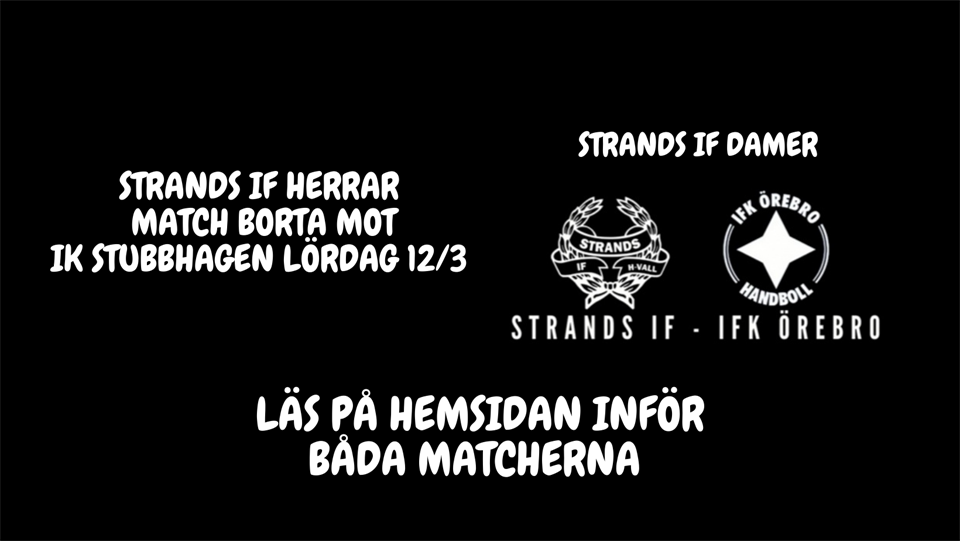 Sportlov för våra ungdomar och de flesta lagen har varit lediga från handbollsträning. Så fredagens teknikträning på Idrottshallen pausar vi och kör igång igen nästa vecka! På lördag spelar Strands herrar sin sista bortamatch (avslutar hemma nästa helg), och det finns stora chanser att en vinst följer med hem! En intervju med herrarnas Aleksander Nielsen finns nu på hemsidan -> Inför; IK Stubbhagen borta Damerna spelar på söndag sin sista hemmamatch på Idrottshallen med start kl 16.00! IFK Örebro kommer på besök till glada Hudik. En intervju om söndagens drabbning med Julia Ekvall kan ni läsa här -> Inför; sista hemmamatchen Matchen sänds även på solidsport ->Strands IF - IFK Örebro Damernas u-lag har ledigt i helgen och spelar sista matchen lördag 19/3 mot Avesta på bortaplan.. / Strands IF handboll