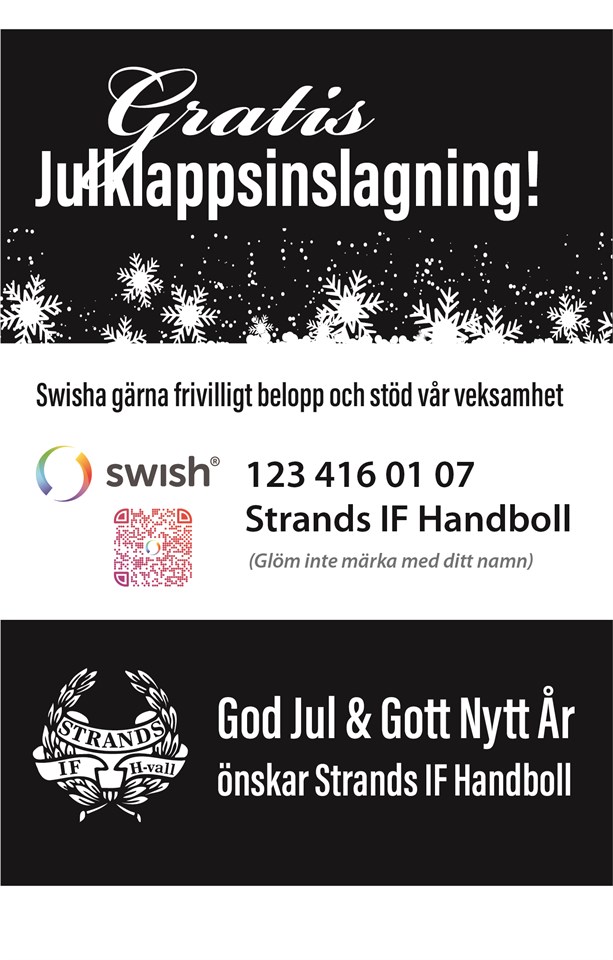 Till er alla julhandlare vill vi passa på att meddela att Strands IF Handboll finns på plaats vid Hudikgalleriorna vid f.d Fyren och hjälper er alla med julklappspaketinslagning. Från kl. 10.00 varje dag och fram till torsdag den 23 december. Vi hjälper er alla! Tack för ditt stöd till vår verksamhet inom Strands IF Handboll. God Jul vill vi alla inom Strands IF Handboll passa på att önska. Strands IF Handboll!