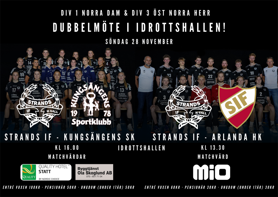 En helg, vilket innebär 1; a advent (söndag), en helg med Strandpromenaden lördag, en helg där det spelas Ungdoms-SM och bl. a är Strands F14-lag är nere i Märsta för steg 2. Det är också en handbollssöndag med dubbla seniormatcher i Idrottshallen, Hudiksvall. ”Alla mot Idrottshallen” söndag. Ja, det får vi hoppas. Det är en välfylld söndag. Nere på stan är det skyltsöndag. I Idrottshallen kl. 13.30 spelar Strands herrar mot Arlanda HK. i div. 3 Norra. En oviss utgång, där dock gästerna från Märsta får bära på favoritskapet. Kl: 16.00 spelar sedan Strands damer. Det är Kungsängens SK som väntar på andra sidan planhalvan i Norra damettan. Ett lag, precis som Strands IF, har haft en tuff start på säsongen och har ett spelarmaterial som på förhand ska vara ett topplag, men precis som Strand har drabbats av skador. Det finns en bra mixed med ett par äldre spelare och yngre förmågor. Hemmalaget då? Ja, vi ska nu räkna med att laget har energi och stärkt sitt självförtroende efter förra helgens vinst på bortaplan mot HK Silwing/Troja, 26–22. På hemmaplan är Strands damer svårslagna, och det förutsätter så klart att det hårda jobbet måste göras i 60 minuter. Det lär bli en hel del springande. Båda lagen uppskattar att springa på kontring. Vi ses i Idrottshallen och missa inte skyltsöndagen i Hudikgalleriorna. Trevlig helg! Strands IF Handboll