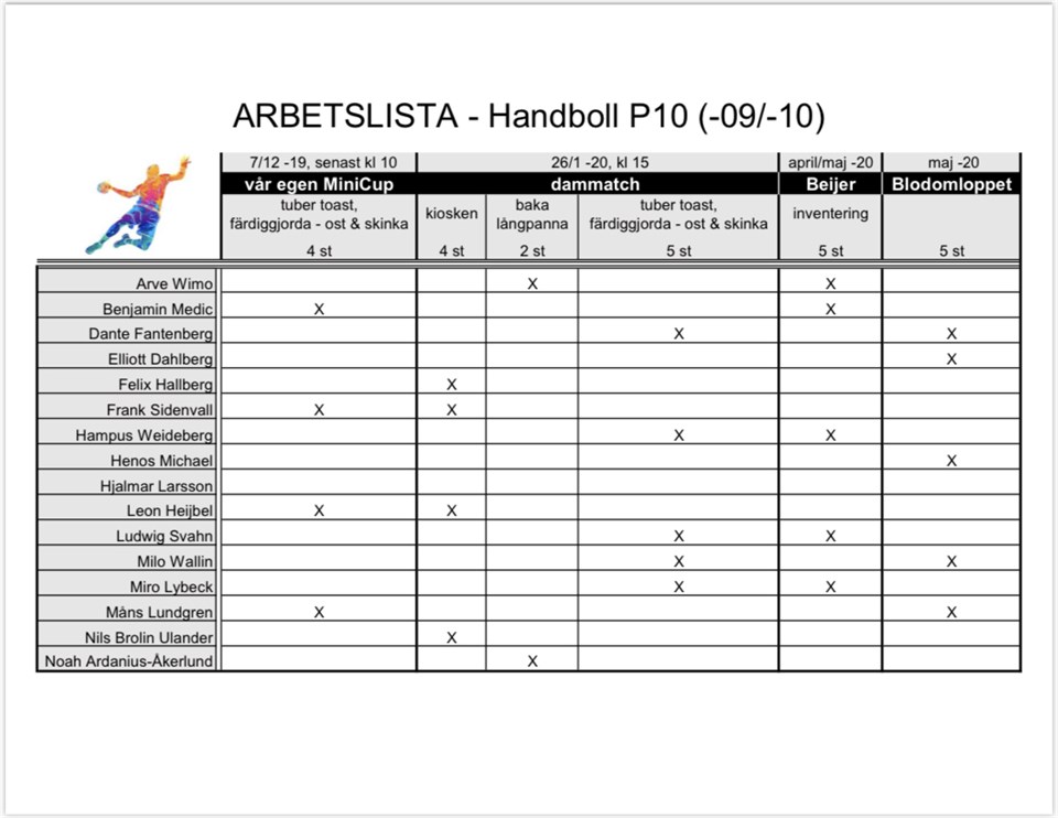 Hej, hej! Framöver kommer några olika tillfällen då vi fått arbetsuppgifter att göra. Om ni inte kan det pass ni fått så byter ni sinsemellan :-) Handboll P16 - 2009/2010 30 nov 2019 1kommentar