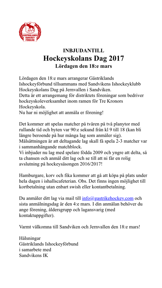 Traditionsenligt så arrangerar Sandvikens IK avslutningen för hockeyskolan med en dag full av matcher. Vi behöver anmäla hur många lag som kommer från Strömsbro så svara gärna på utskickad inbjudan. Mer information i nyhetens bild! Hockeyskolan 16 feb 2017 0kommentarer