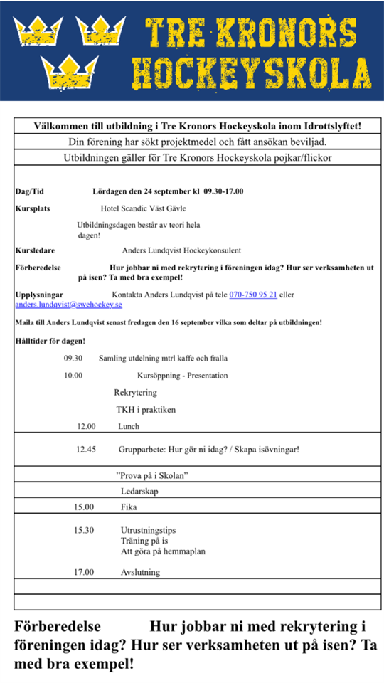 Starten av skridskoskolan närmar sig och den 24 september är det dax för den årliga utbildningen för gamla och nya ledare i Tre kronors hockeyskola! Föreningen har fyra platser till denna dag där Anders Lundqvist från hockeyförbundet bjuder på gofika och lunch, det bjuds naturligtvis på nyttig information inför hockeyskolestarten oxå. Så är du ledare, vill bli ledare eller bara är nyfiken på om detta är något för dig! Då ska du inte tveka, hör av dig till Thomas på 0706980986 eller Thomas.fahlstedt@gavle.se för mer information. Hockeyskolan 31 aug 2016 0kommentarer