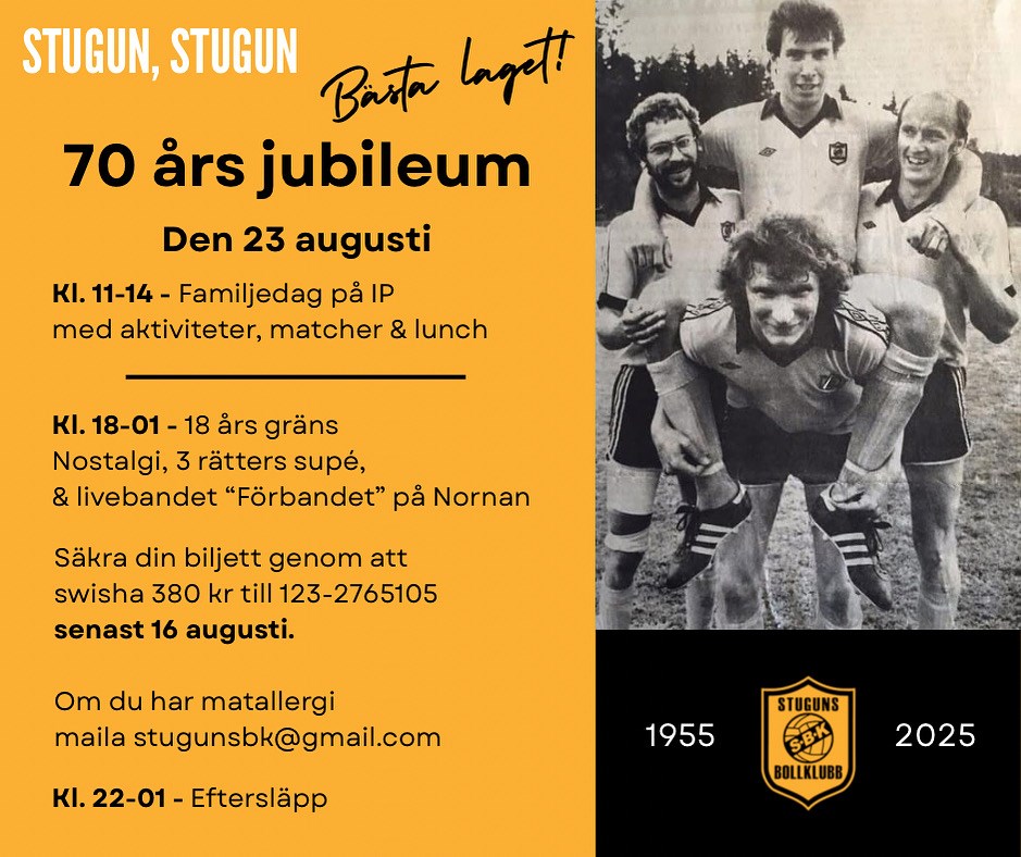 70 års jubileum, 23 augusti Kl. 11-14 - Familjedag på IP med aktiviteter, matcher & lunch Kl. 18-01 - 18 års gräns 3 rätterssupé, nostalgi & livebandet “Förbandet” Säkra din biljett genom att swisha 380 kr till 123-2765105 senast 16 augusti Om du har matallergi maila stugunsbk@gmail.com Kl. 22-01 - Eftersläpp Stuguns BK 1 jul 0kommentarer
