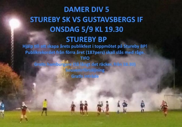 Nu är det dags för årets publikfest på Stureby BP! Onsdag 5/9 kl 19.30 tar Stureby SK Dam emot Gustavsbergs IF. Det bjuds på hamburgare från kl 18.30 (Så långt lagret räcker), TIFO, Souvenirförsäljning mm. Slut upp och hjälp till att skapa festen. Stötta ditt lokala lag, Forza Sturpen!