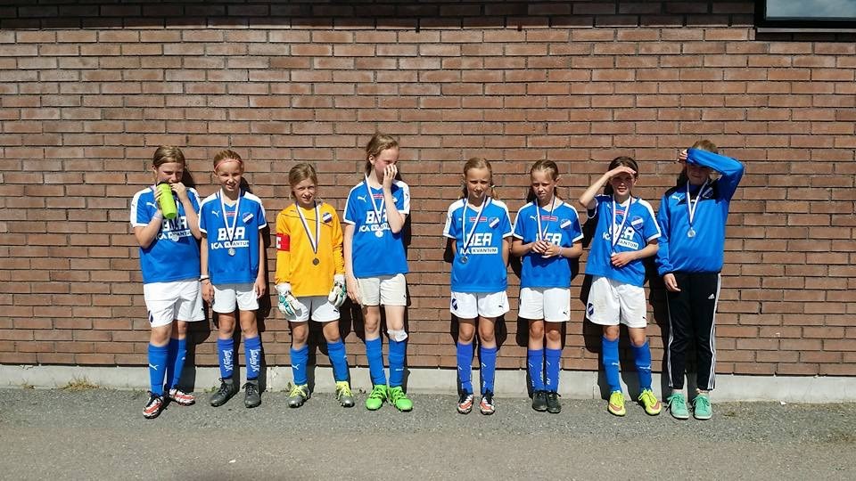 För andra året i rad styrde vi kosan till Västerås och Aroscupen med nästan full trupp och två deltagande lag. Nytt för i år var att vi hade sällskap av ytterligare 13 Sturpen-lag, men precis som vanligt var det F-05 som visade var skåpet ska stå både på och utanför planen. Enastående glädje och sammanhållning Detta fantastiska gäng tjejer har verkligen något alldeles speciellt tillsammans. Här är det helt självklart att åka iväg tillsammans och umgås alla 20 i olika konstellationer hela dagarna utan minsta tillstymmelse till tjafs eller bråk, trots att nattsömnen på en luftmadrass i ett klassrum kanske inte alltid är den bästa. Om det är något vi är extra stolta över så är det just den härliga sammanhållning och respekt för varandra som finns i laget. Som ledare är det verkligen något speciellt att få uppleva att när det ena laget ska spela morgonmatch så väljer alla i det andra laget utan att blinka att kliva upp tidigt i ottan och äta frukost för att följa med och heja fram de andra. Fina prestationer i regn och solsken Cupen igenom bjöds på en rad fina prestationer där det som ligger närmast på näthinnan är den insats som lag blå visade upp i sin slutspelsmatch mot hemmaföreningen Skiljebo SK. Efter ett riktigt tufft gruppspel mot starkt motstånd hade många lag vikt ner sig när det dessutom var mer gyttjebrottning än fotboll i lördagens matcher, men inte SSK:s grymma tjejer. Tvärtom så gjorde många i laget sin absolut bästa match och den kämpaglöd och vilja som visades upp i leran kommer vi sent att glömma.Alla ledare och föräldrar som var på plats i regnet kan nog skriva under på att det var sjukt spännande och att vilt krigande SSK-tjejer förtjänade ett bättre öde än den knappa förlust som det till slut blev. Lag vit hade å sin sida en rejäl känslomässig berg-och-dalbana i dagarna tre. Trots en inledande seger mot AIK Akademi och ytterligare vinster med 7-0 och 11-0 mot IK Frej respektive Reymersholms IK så blev det B-slutspel på målskillnad efter en match mot finländska Paimon Haka som slutade med förlust 0-3 trots spel på motståndarnas planhalva i princip hela matchen. Extra tungt med tanke på att AIK Akademi sedan gick vidare och vann hela cupen tämligen enkelt. Sådan är dock fotbollen ibland och trots någonstans mellan 15-20 bollar i virket under cupen går det inte att skylla på otur, vi behöver helt enkelt bli mer effektiva framför motståndarnas mål för att utnyttja det stora spelövertag vi nästan alltid har. Skönt ändå att tjejerna är föredömen i att gå vidare och ladda om. Någon timme efter att tårarna torkats efter gruppspelet så var glädjen tillbaka och i lördagens och söndagens B-slutspel ledde hela vägen fram till seger i finalen och pokalen kunde fraktas hem till Sturpen. Löften är till för att hållas! Förutom alla fina insatser på planen så tar vi med oss många andra härliga minnen hem. Bl a en match med P-06 på skolgårdens grusplan som låg helt under vatten (därav ev leriga kläder och skor som kom med hem), men också ett löfte från Peter om att bada med kläderna på i Vivstavarvsparken efter att Elin satt ett efterlängtat mål. Vi är många som kommer att se till att löftet infrias när vi ses igen efter sommaruppehållet. Sommarledigt! Nu tar vi alla lite uppehåll från fotbollen i sommar, men om det finns tid och lust så är det bara att ut och öva på de sommarläxor som delades ut innan vi skiljdes åt efter Aroscupen. Träningen drar igång igen så smått för de som är hemma 26 juli. Som ni kanske har sett blir det heller inget av med Eskilscupen. Vi fick tyvärr några avhopp som innebär att vi inte fick ihop två lag, och hellre då än att åka med ett lag och lämna några hemma så har vi valt ett annat upplägg. 4-5 augusti kör vi träningsläger på hemmaplan, och på lördagen 6 augusti åker vi till Rallarbollen i Gävle för cup över dagen. Precis som förra året kommer några då att spela mot killar i P-05-klassen och sedan kör vi också ett lag i F-05-klassen. Då man får spela i bägge klasserna kommer några från "killlaget" också att spela i F-05 varje match så att vi får ihop två lag. Slutligen vill vi ledare passa på att tacka för de fina sommarpresenterna! Mycket gott och uppskattat :-)