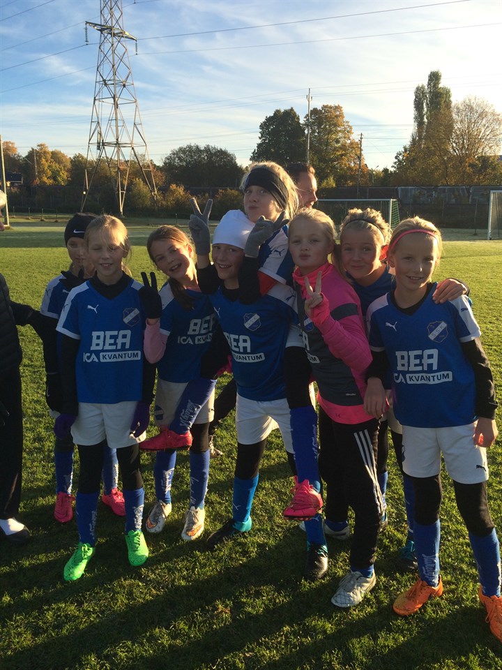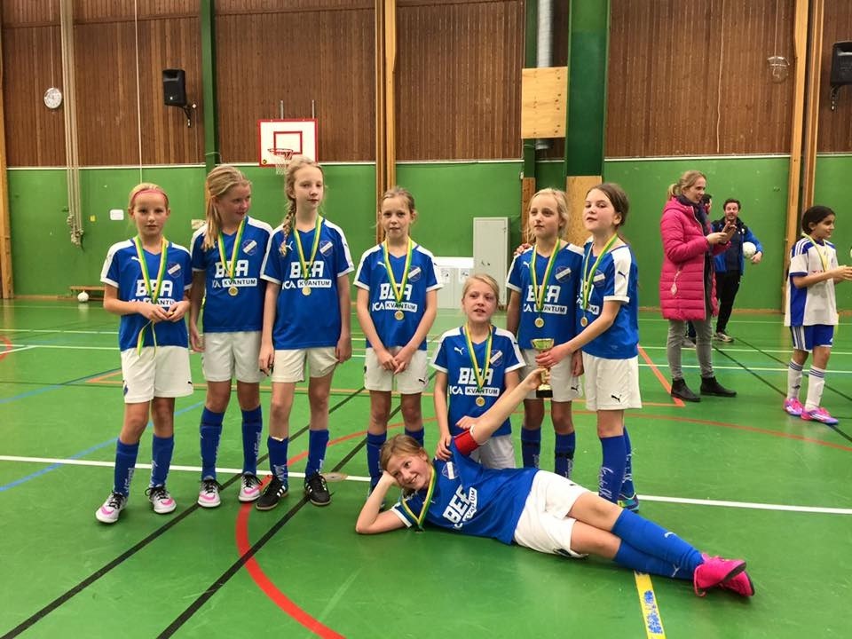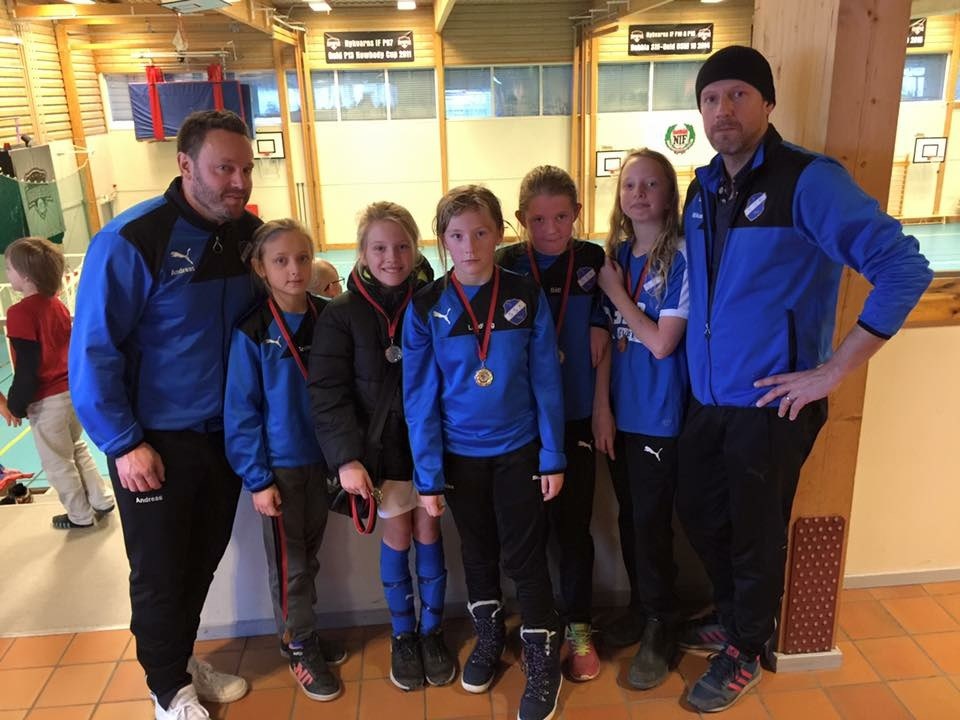 Fantastiska prestationer mot stora och starka motståndare i Västerås! Det vilade kraftig dimma över vägarna när Sturpens gladaste tjejer satte av mot Västerås 06.30 i lördags morse. Vår vana trogen söker vi alltid utmaningar för att fortsätta utvecklas och denna gång var det spel i 04-klassen som gällde. Målsättningen var att utmana tjejerna att våga fortsätta spela vårt spel även mot fysiskt starkare och snabbare spelare och att höja tempot i passningsspelet. Frostigt gräs i premiären Inledningen mot Irsta IF kändes på förhand lite knepig då gräset var täckt av frost och det var minusgrader i luften. På planen märktes dock inget utan tjejerna trillade boll fint och kunde avfärda motståndarna relativt enkelt med 3-0. En perfekt start! Efter lite värme väntade tuffare motstånd i form av KIF Örebro, ett riktigt storvuxet lag med ett rejält publikstöd. Våra små krigare tog verkligen utmaningen på rätt sätt och växlade upp tempot i passningsspelet på ett sätt som gjorde det riktigt svårt att komma åt oss. Precis som tidigare i år hade vi dock lite problem med effektiviteten i bägge straffområdena och med fysiskt starkare motståndare blev det också tuffare i närkamperna framför målen. Trots ett massivt bollinnehav och riktigt bra spel fick vi nöja oss med 1-1. I den sista gruppspelsmatchen väntade Enebyberg, och nu var det lite soppatorsk efter en lång dag. Vi vinner ändå relativt komfortabelt med 2-1 i en match som visar att vi har höjt vår lägstanivå rejält. Vidare till kvartsfinal! Spännande slutspel Lottningen slumpade sig så att vi återigen fick möta KIF Örebro i kvartsfinalen på söndagsmorgonen. Nu tryckte tjejerna plattan i botten ännu mer och vi radade upp heta chanser utan att sätta pricken över i. Lite typiskt då att matchen istället avgjordes på ett slumpskott, om än ett bra sådant! Vidare till semi och vild glädje! I semifinalen väntade Rynninge IK som hade imponerat på vägen fram till semin. Nu skrämde det dock inte söders blå alltför mycket utan det var full fart framåt direkt som gällde, och sånär fick vi utdelning direkt på avspark. Första tio var spelmässigt riktigt bra, men tyvärr kunde vi inte riktigt få dit bollarna. Istället fick motståndarna utdelning på en hörna som trycktes in från nära håll. I slutet av halvleken fick Emma oturligt en boll i ansiktet och i röran efter målvaktsbytet kunde Rynninge göra 2-0 precis innan paus. Emma kom dock tillbaka starkt och det gjorde även resten av tjejerna i Sturpens stolthet. Frånsett en kort period så var det stort bollinnehav och fint spel men lite svårt att ta sig hela vägen till de stora chanserna. Till slut kom dock utdelningen när ett skott i krysset gav 1-2 och lite hopp. Tiden var dock för knapp och det var bara att gratulera Rynninge till en finalplats! En final som de sedan vann mot BP. Grattis Rynninge! Vi tar med oss att vi klarar av att spela ett snabbt och fint passningsspel även mot större och äldre motståndare. Hoppas också att tjejerna tar åt sig av allt beröm från motståndartränare. För oss ledare och den lilla men starka klacken var det ett nöje att se den härliga tekniken, spelglädjen och lagandan. Ni är verkligen otroliga tjejer!