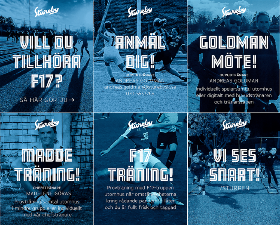 Häng med oss när vi växlar upp ett steg till 2021! Uppåt, framåt! De som känner oss vet att det alltid finns en ny utmaning, ett nästa steg att ta. När vi nu går in i Sturebys elitförberedande verksamhet som F17 kommande säsong bygger vi självklart vidare på 2020-upplägget med spel i de bästa och största cuperna, seriespel i F17 SM-serien, samt en målmedveten fys- och teknikträning med extern hjälp under vintersäsongen. En del är också nytt. Med Madelene Göras in som chefstränare för den elitförberedande verksamheten kommer vi att säkra att vi utbildar modiga & moderna spelare, och varje spelare får också ännu bättre möjligheter till utveckling via såväl individuell träning som feedback. För många spelare är det också dags att ta nästa steg i sitt seniorspel, och med vår unika setup med samarbete i match och träning med bägge våra damlag i division I & III så finns alla bitar på plats. Hur kan jag hänga på? Intresset för provträning har varit riktigt stort, vilket såklart känns superroligt, och vi har redan kunnat presentera tre grymma nyförvärv till kommande säsong. Vi vill gärna bli några till, både utespelare och målvakter födda 2004–2005 men givet rådande pandemi så kommer vi av naturliga skäl inte att kunna bjuda in större grupper till provträning. Vi har i år istället ett upplägg där du först får träffa huvudtränare Andreas Goldman för samtal och därefter provträna i mindre grupp tillsammans med vår chefstränare Madelene Göras. Vi kommer att inleda denna process redan denna vecka och sätter truppen under november/december. Några tider är redan uppbokade, men gör en intresseanmälan via telefon eller mejl till andreas.goldman@sturebysk.se eller 070-5533765 om du tror att säsongsupplägget nedan är det du vill göra 2021 så löser vi tider som passar. Seriespel - SM F17 (Med målsättning att ta oss så långt som möjligt i slutspelet) - Dam Division I (För att utmana de som ligger allra längst fram) - Dam Division III (För att få nyttig erfarenhet av seniorfotboll) - Stockholmsserien tillsammans med våra bägge damlag (För att få en praktisk inskolning i seniorfotbollen) Cuper & Resor - Göransson Cup (Lagbygge & Kul avbrott i träningen) - Träningsläger mars - Girls Elite Cup F17 - Aroscupen - Gothia Cup - Lisabon Cup Försäsong Vi fortsätter självklart på inslagen väg med tung skivstångsträning och tuffa fyspass (uthållighet, spänst, snabbhet) för att förebygga skador och för att kunna spela den fotboll vi vill. Självklart bryter vi av och jobbar även i är med teknikträningen tillsammans med vår mångåriga partner Goeras Football Education. Under hela försäsongen genomför vi 4–5 pass i veckan och målsättningen är att komma bättre förberedda än någonsin 2021. Fotbollsträningen genomförs under denna period inte bara utomhus på vinterröjda planer utan även inomhus på konstgräs. Träningsupplägg under säsong Under säsong är det fyra pass per vecka som gäller, där ett av passen är fokuserat på positionsanpassad utveckling tillsammans med Goeras Football Education/Madelene Göras och/eller fys. Under våra gemensamma pass fortsätter vi att utveckla både spel och spelare på samma framgångsrika sätt som tidigare. Med en fantastisk träningskultur och utmanande men samtidigt trygg miljö kan vi erbjuda alla tänkbara möjligheter för den som verkligen vill framåt.