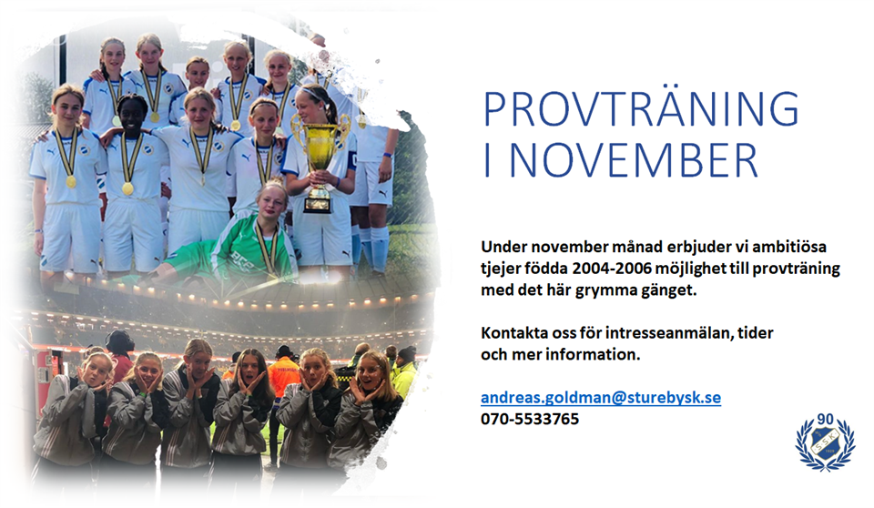 Förtjänar du också extra allt? Häng på oss 2020 Att stå stilla har aldrig varit vår grej. Därför kan det knappast komma som en överraskning för någon att vi nu steppar upp ytterligare när vi satsar vidare mot spel på fullstora ytor. Säsongen 2020 innebär spel i de bästa och största cuperna, seriespel i F17 SM-serien, samt en målmedveten fys- och teknikträning med extern hjälp under vintersäsongen. Vi fortsätter att utvecklas i hög hastighet och vill gärna ta med ytterligare några tjejer, både utespelare och målvakter födda 2004-2005 på denna resa. Kontakta tränare Andreas Goldman på andreas.goldman@sturebysk.se eller 070-5533765 om du tror att säsongsupplägget nedan är det du vill göra 2020. Seriespel - Futsalligan F-04 & F-05 (avbrott i uppbyggnadsträningen) - SM F17 (Tuffa och utvecklande matcher varje helg) Cuper - 4v4 SM - ST-cupen - Växjö Invitational (Elitcup för 8 inbjudna lag i januari 11v 11 inomhus i januari) - Nömme Cup Invitational Tallinn (Vi tar oss an bl a Estland & Lettlands F17-landslag inomhus 11v11 i februari) - Halör Invitational (Inofficiella SM för 15-åringar för 16 inbjudna lag i maj) - Aroscupen - Gothia Cup - Cup utomlands i oktober Försäsong Vi fortsätter självklart på inslagen väg med teknikträning under försäsongen med hjälp av vår nära partner Goeras Football Education/Madelene Göras. I år väljer vi bort Futsal-träningen till förmån för ett gediget upplägg för fysträning som förutom en hel del löpning inkluderar brottning och styrketräning med vikter med externa tränare. Under hela försäsongen genomför vi 4-5 pass i veckan och målsättningen är att komma bättre förberedda än någonsin 2020. Fotbollsträningen genomförs under denna period inte bara utomhus på vinterröjda planer utan då och då även på Super Center Soccer i Danderyd i värmen. Träningsupplägg under säsong Under säsong är det fyra pass per vecka som gäller, där ett av passen är fokuserat på individuell utveckling tillsammans med Goeras Football Education/Madelene Göras. Under våra gemensamma pass fortsätter vi att utveckla både spel och spelare på samma framgångsrika sätt som tidigare. Med en fantastisk träningskultur och utmanande men samtidigt trygg miljö kan vi erbjuda alla tänkbara möjligheter för den som verkligen vill framåt.