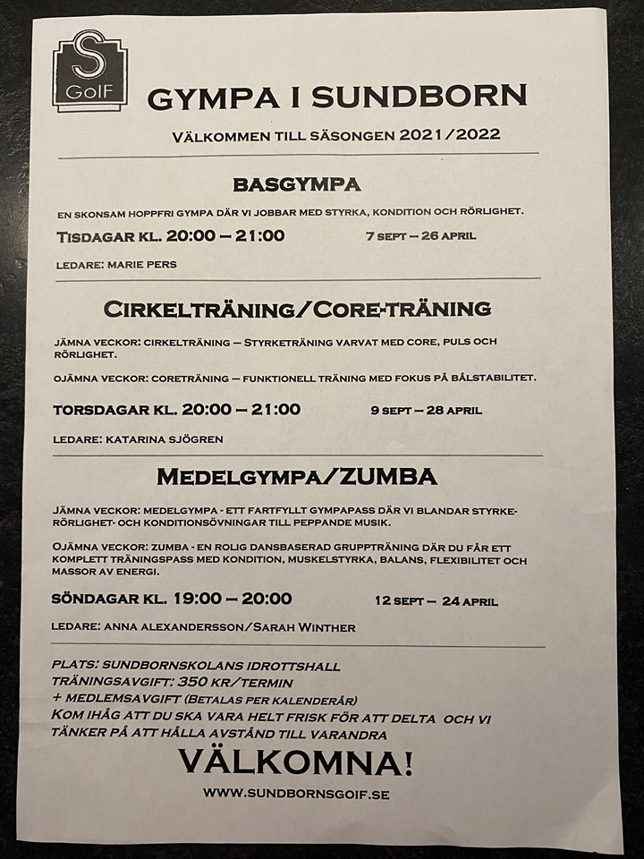 Vi har nu avslutat utesäsongen på multiarenan för Gympa och Zumba. Vi vill rikta ett Stort Tack till alla som deltagit på multiarenan under vår- och sommarperioden! 😊 Vi drar igång verksamheten igen inomhus i Sundborns Idrottshall Tisdagen den 7 September. Schemat för hösten kommer vara: Tisdagar: Basgympa 20.00-21.00 Torsdagar Jämna veckor: Cirkelträning 20.00-21.00 Torsdagar Ojämna veckor: Coreträning 20.00-21.00 Söndagar Jämna veckor: Medelgympa 19.00-20.00 Söndagar Ojämna veckor: Zumba 19.00-20.00 Träningsavgiften är 350 kr/termin samt medlemsavgift i Sundborns GoIF som betalas per kalenderår, 200 kr/person eller 400 kr/familj. Bankgiro: 423-6360 Det går naturligtvis bra att komma och provträna någon gång innan betalning. För att delta måste du vara helt frisk och vi fortsätter tänka på att hålla avstånd till varandra och anpassar träningen utefter detta. Handsprit samt rengöringsmedel kommer finnas på plats. Vi ses i hallen! Välkomna! Gymnastiksektionen 18 aug 2021 0kommentarer