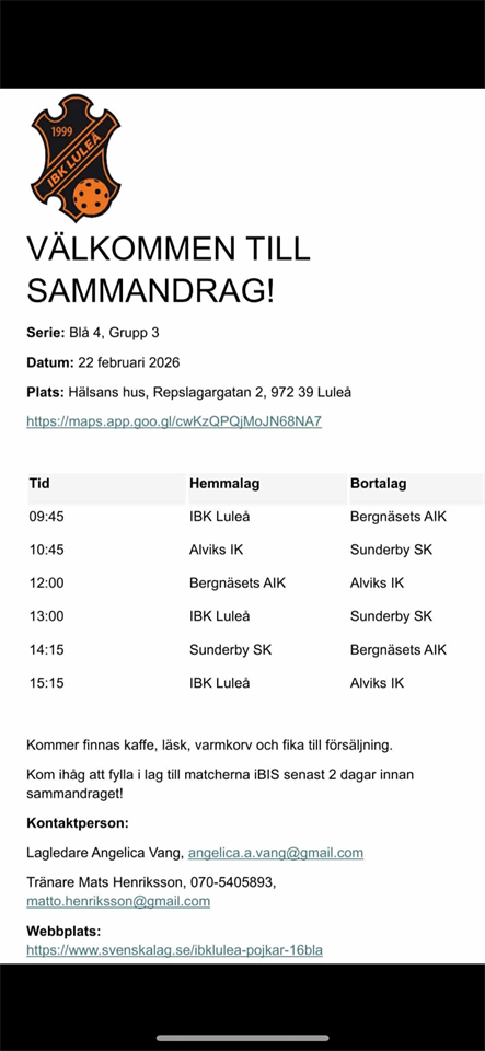 Klicka på bekräftelselänken i det mejl vi skickat dig för att börja ta emot uppdateringar från Sunderby SK Innebandy P-16.