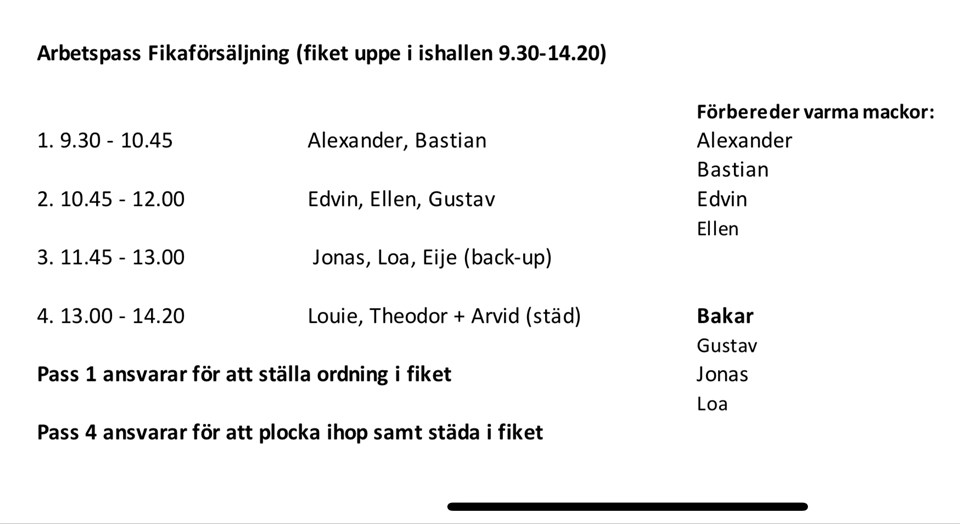 Någon som ska baka eller förbereda varmamackor som kan tänka sig att byta mot vårt pass? ( sista fikapasset/Theodor)