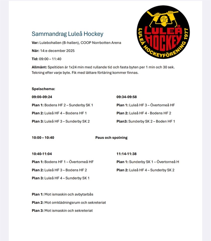 14 december Arrangör: LULEÅ HOCKEY COOP C-HALLEN SAMLING: 08.30 SSK 1 Målvakt: Devin Noe Viggo Badr Isak Wilgot Frank Bobby Andrij Leo Jona Tränare: Jocke R Robert Niklas SSK 2 Målvakt: Alfred S Ture Tim Alfred M Einar Loui Bror Oscar H Theo Samuel Tränare: Jocke S Lowe Jonas Hockey-17 7 dec 2025 0kommentarer