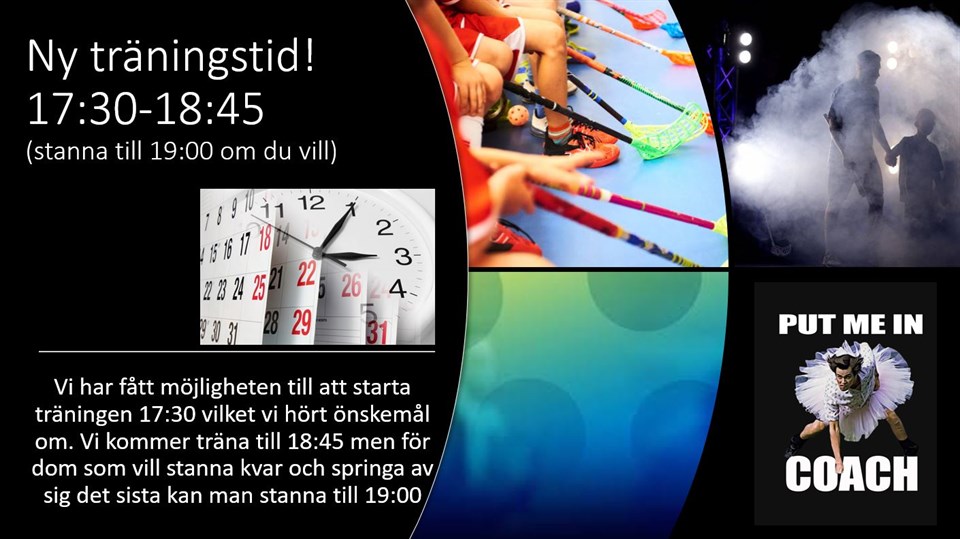 Hej alla fantastiska innebandyälskare! Då träningstiden efter oss har blivit avbokad har vi fått möjligheten att ändra träningstid till 17:30-18:45 vilket gäller från tisdag 5/12! Vi har fått flera önskemål om senare start på träningen och därför känns det extra bra att vi kan göra denna förändring. För er som var inställda på 17-18 imorgon 5/12 så kommer vi vara där från 17 så ni kan komma och behöver ni då avvika vid 18 så gör ni det. Nytt från nu är: Tid: 17:30-18:45 Träning: 75 minuters träning som vi tror kommer vara till det bättre Möjlighet: Att stanna kvar en extra kvart fram tom 19:00, för spontanspel och lek Vi kommer köra dessa träningar de resterande 3 träningarna för året, för att sedan utvärdera. Vi ses imorgon och lev livet