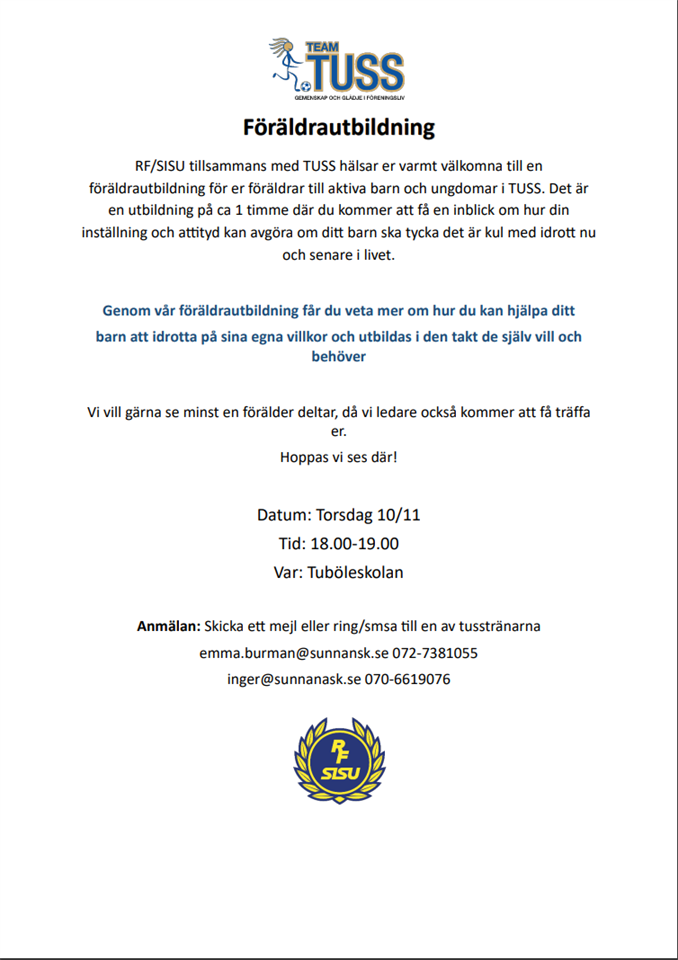 Vi välkomnar föräldrar till barn och ungdomar i TUSS till en föräldrautbildning på Tuböleskolan. Torsdag den 10/11 18.00-19.00 Vi ses där! Tussyngre 24 okt 2022 0kommentarer