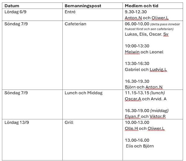 Bemanningen är lagd…OCH Vi har fått förändringar i lunch och middag söndag 7/9. Då den fått restriktioner till att serveras i fryxellskas matsal och inte i Helmias cafeteria.