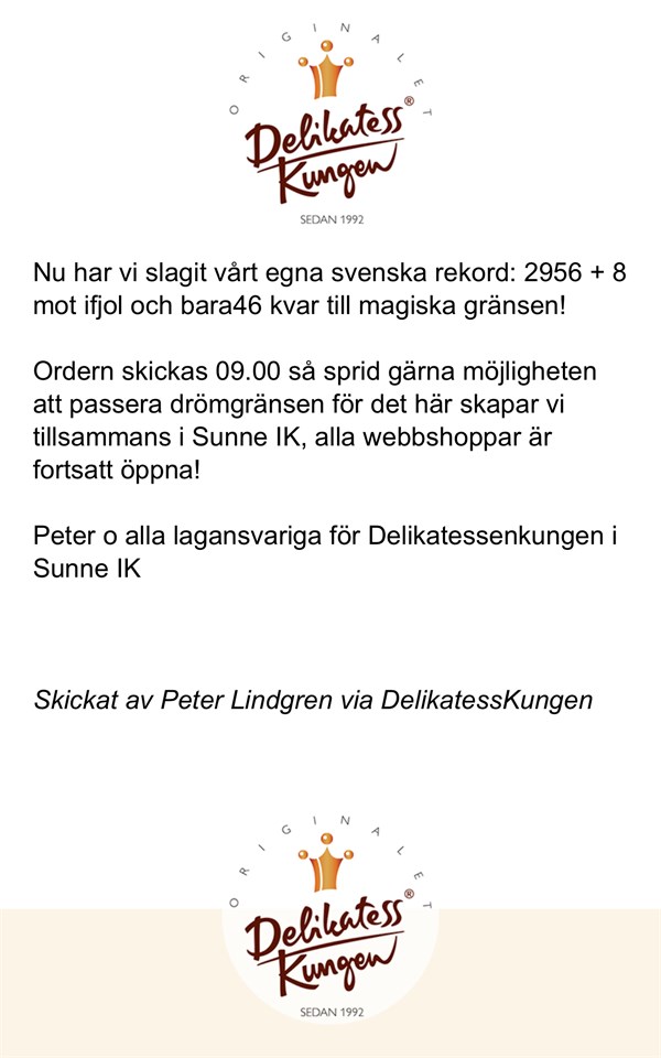 Stort tack till alla som sålde delikatesskungen! Totalt sålde hockeyskolan 203 produkter och hela klubben sålde totalt 3050 produkter, vilket betyder att vi nådde målet att sälja minst 3000 produkter, Woho! Detta innebär ett stort plus i kassan för Sunne IK och att vi kan fortsätta driva klubben framåt ⭐