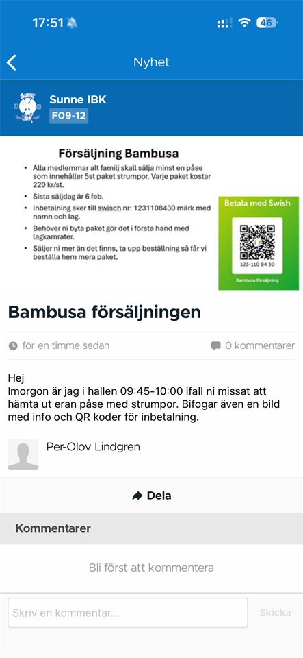 Klicka på bekräftelselänken i det mejl vi skickat dig för att börja ta emot uppdateringar från Sunne IBK A-lag Damer.
