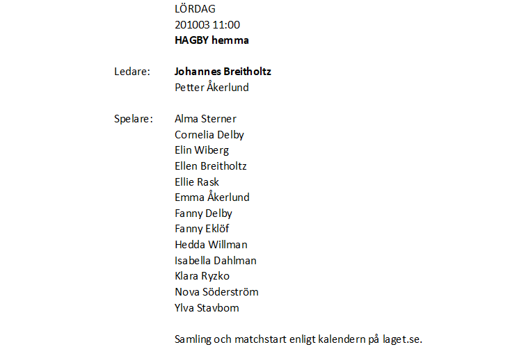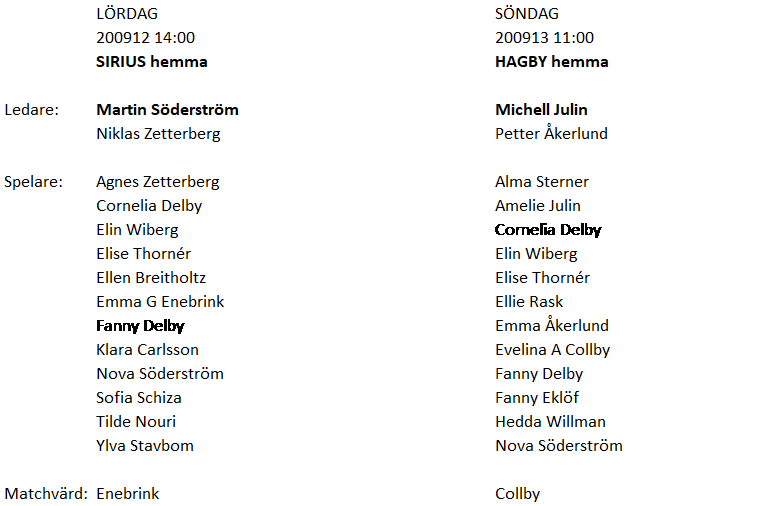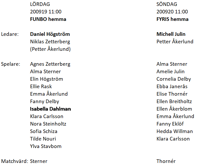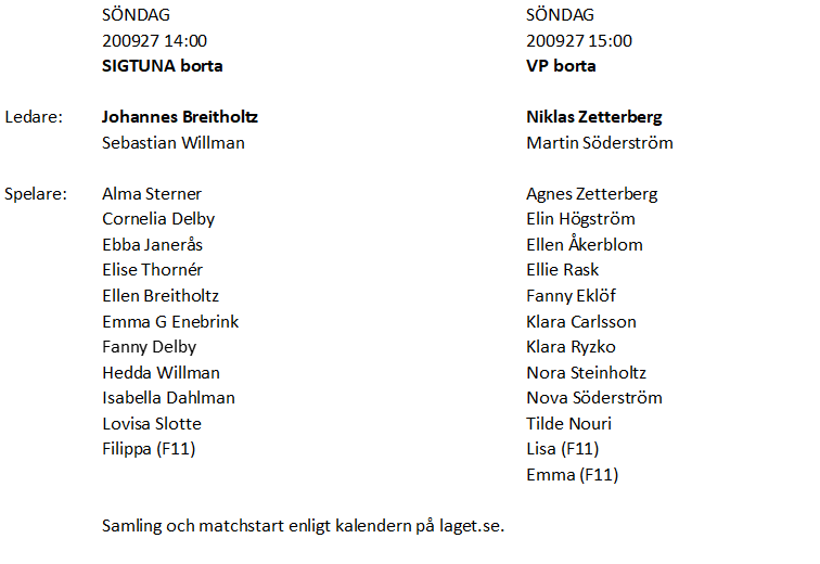 Lagindelning enligt bilden. Reserver Amelie och Klara C, pga flest spelade matcher den här säsongen! Samling och matchstart enligt kalendern! Ses imorgon!