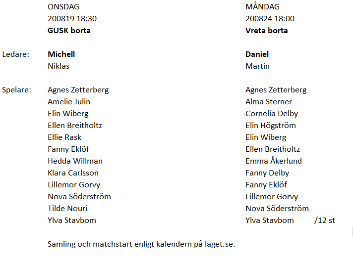 Lagindelning enligt bilden. Matchvärdar: Rask (lördag), Sterner (söndag) Samling och matchstart enligt kalendern på laget.se (observera olika starttider lördag, söndag) F-2010 24 aug 2020 0kommentarer