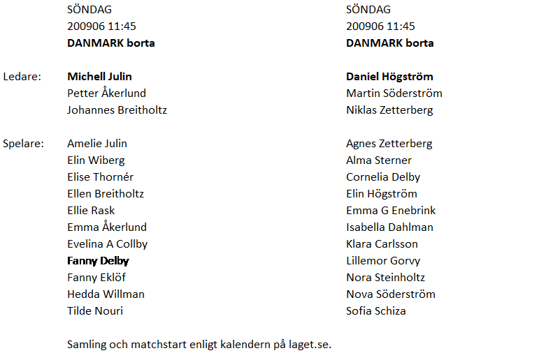 Här kommer lagindelningen! Observera att det är en hel del tjejer som spelar båda matcherna, vi har därför skjutit på match nummer två till 13:00 så att de hinner äta lunch emellan. Övriga tjejer som spelar match nummer två samlas 12:15 med Daniel för uppvärmning och matchgenomgång! Givetvis är de föräldrar vars barn skall äta lunch välkomna ner till Graneberg under förutsättning att ni håller på den sociala distansen! LÖRDAG 200815 11:00 Alsike hemma Michell Niklas Johannes Cornelia Delby Elise Thornér Emma G Enebrink Emma Åkerlund Fanny Delby Lillemor Gorvy Agnes Zetterberg Amelie Julin Ellen Breitholtz Klara Carlsson Hedda Willman Alma Sterner Isabella Dahlman Matchvärd: Delby LÖRDAG 200815 13:00 Bälinge hemma Michell Niklas Daniel Ebba Janerås Elin Högström Fanny Eklöf Klara Carlsson Tilde Nouri Ylva Stavbom Agnes Zetterberg Amelie Julin Ellen Breitholtz Klara Carlsson Hedda Willman Alma Sterner Isabella Dahlman Matchvärd: Janerås F-2010 14 aug 2020 0kommentarer