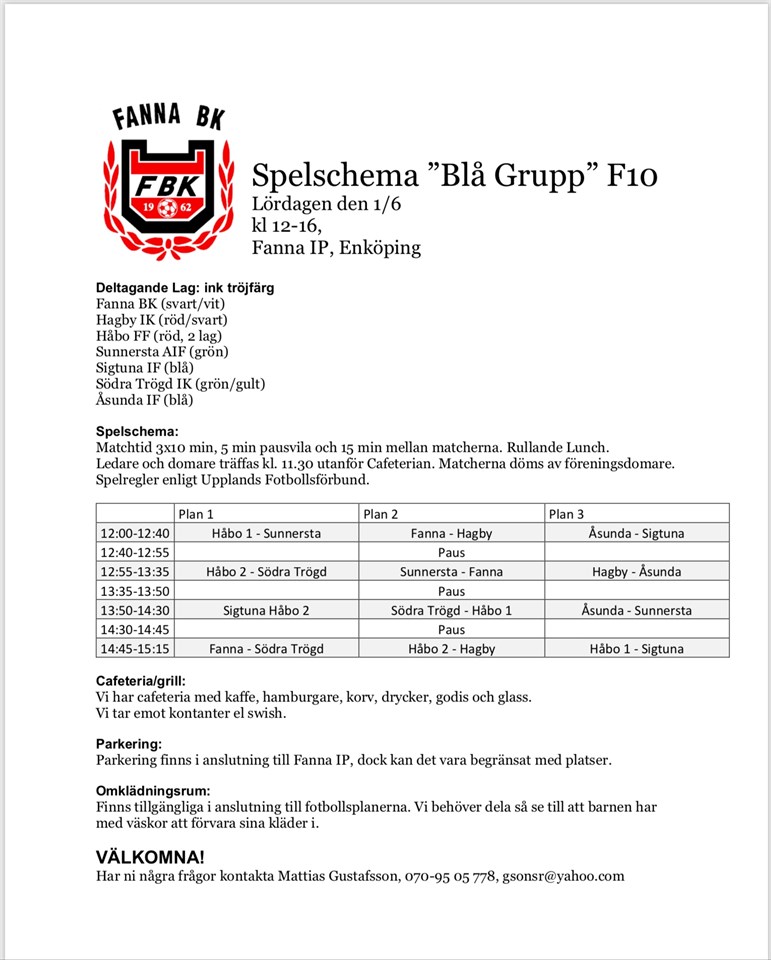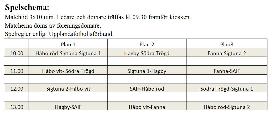 Deltagande lag: Hagby IK (röd) SAIF (Grön) Sigtuna IF (blå) 2lag Södra Trögds IK (grön) Fanna BK (svart/vit) Håbo FF(lag vit & lag röd) Matchtid 3x10 min. Matcherna döms av föreningsdomare. Spelregler enligt Upplandsfotbollsförbund. Spelschema enligt bilden. Omklädningsrum: Finns tillgängliga nära fotbollsplanerna. Vi kommer att få dela omklädningsrum. Det finns även gräsyta tillgänglig att kunna slå upp ett tält om man vill. Kiosk/Grill: De har en kiosk med kaffe, korv, hamburgare, drycker, godis och glass. De tar emot kontanter eller swish. SAIF:s första match är 11:00 så vi samlas 10:00 vid Pavven (alternativt 10:30 vid Hagby IP) Kartreferens: https://goo.gl/maps/DSCmgcq4hzx4WmW96 Glöm inte att smörja in barnen med solkräm och skicka med vattenflaska och keps!