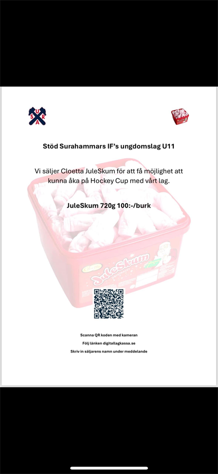 Hej världens bästa hockeyföräldrar! Nu har vi fått hem många Juleskums burkar så jag hoppas ni är redo att börja sälja! Om alla tar minst 4st var på träningen imorgon tisdag så kommer pallen snabbt vara borta. För att motivera lite extra så får den som säljer flest burkar självklart ett sött pris! Men det är först till kvarn på de 174 burkar som vi har. Om försäljningen går snabbt finns möjlighet att få hem en till pall. En viktig detalj gällande betalning av de vi säljer. All betalning ska gå via qr-koden och ska märkas med barnets namn så vi kan följa upp vem som sålt/betalat. Ni får ett utskrivet säljblad med qr-kod i samband med de första burkarna. Lycka till med försäljningen! U12 9 sep 2024 0kommentarer