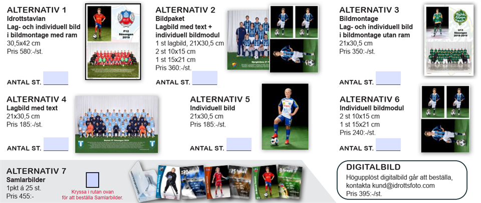 I år testar föreningen något som förhoppningsvis kan bli en årlig tradition, nämligen lagfotografering. Samtliga lag i hela Svärdsjö IF kommer att fotograferas och varje spelare kommer också ges möjlighet att få ta ett individuellt kort. När: Tisdag den 26 augusti (från cirka kl 16:00 och framåt, tidsschema kommer senare) Var: Svärdsjö gymnastiksal. Obligatorisk klädsel spelare: Svärdsjö IF matchtröja (lånas på plats), blå shorts + blå strumpor, fotbollsskor. (ledare pratar ihop er så ni har samma kläder, matchtröjor i vuxenstorlek lånas på plats). Ta med: Utskriven och signerad beställningsblankett. Fotograferingen är kostnadsfri och spelarna får själva välja vilka bilder de vill köpa. Bilderna beställs via beställningsblanketten. Det är företaget Idrottsfoto som kommer att fotografera oss. De fotar lag i Svensk Elitfotboll, Ettan, SHL, Allsvenskan mm. Kolla gärna in klipp på YouTube från liknande fotografering de gjort. Alla lag samlas ca 30 minuter innan tid för fotografering och varje lag ansvarar för att skicka särskilda kallelser och information till sina respektive lag. Inga föräldrar eller andra personer än ledare och spelare är tillåtna att delta vid fotograferingen. Det är trångt i gympasalen och därför ber vi om hänsyn till att så få andra personer som möjligt än ledare och spelare deltar (för de minsta spelarna får vi försöka lösa det på bästa vis, prata med ledarna om det). Tips: Se till att spelarna har de mesta förberett innan de kommer till fotograferingen. OBS! Kommer man för sent kan man inte delta på fotograferingen. Vi inväntar inga sena spelare, tidschemat måste hålla. Schema start fotografering (tid då fotografering startar, samlingstid sker innan utsatt tid) Tid: XX PF 19/20 (Ledare: Marie M, Patrik M, Louise) Tid: XX F 16/18 (Ledare: Hanna W, Anna, Jelena) Tid: XX P 17/18 (Ledare: Robin, Johan, Erika, Linnea) Tid: XX P 15/16 (Ledare: Erik A, Pontus W) Tid: XX F 13/15 (Ledare: Lina, Magnus) Tid: XX P 13/14 (Ledare: Camilla, Mange, Nyman) Tid: XX F 10/13 (Ledare: Krille, Magnus) Tid: XX Herlaget (Jimmy L) Tid: XX Damlaget (Ledare: Linus, Sarah N, Sara S) Beställningsblankett Beställningsblanketten fylls av vårdnadshavare/spelare över 18 år hemma i datorn, skrivs ut och signeras. Spelaren tar sedan med sig beställningsblanketten till fotograferingen. Det är viktigt att beställningsblanketten är ifylld och medtagen till fotograferingen för att undvika eventuella förseningar. Beställningsblanketten hittas på klubbsidan under Mer/ Dokument / Beställningsblankett 2025. Nu världens bästa ledare behöver vi er hjälp! - Sprid info om detta i era respektive lag. - Be alla skriva upp datum i kalendern! - Återkom till mig med hur många aktiva spelare ni har som förväntas delta på detta senast 1 augsti. Då kan vi spika tischemat och den här eftermiddagen kommer rulla fint. Kommentera detta inlägg eller hör av er om det finns frågor! // Linnea