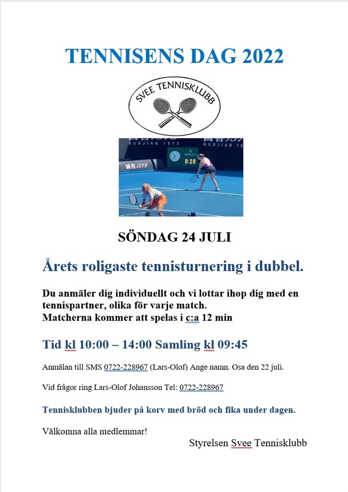 TENNISENS DAG 2022 SÖNDAG 24 JULI Årets roligaste tennisturnering i dubbel. Du anmäler dig individuellt och vi lottar ihop dig med en tennispartner, olika för varje match. Matcherna kommer att spelas i c:a 12 min Tid kl 10:00 – 14:00 Samling kl 09:45 Anmälan till SMS 0722-228967 (Lars-Olof) Ange namn. Osa den 22 juli. Vid frågor ring Lars-Olof Johansson Tel: 0722-228967 Tennisklubben bjuder på korv med bröd och fika under dagen. Välkomna alla medlemmar! Styrelsen Svee Tennisklubb Svee Tennisklubb 10 jul 2022 0kommentarer