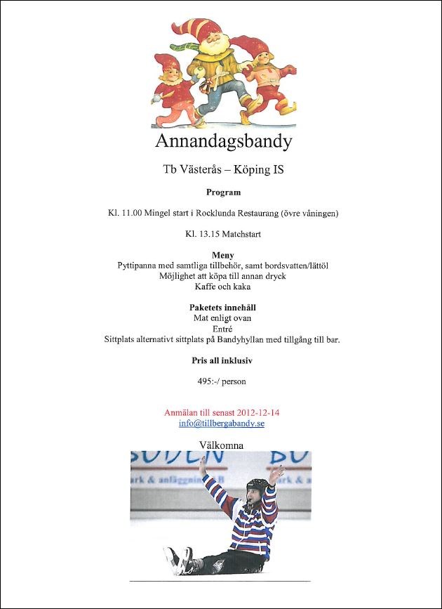 TB Västerås - Köping Program Kl 11,00 Mingelstart i Rocklunda restaurant (Övre våningen) Kl 13.15 Matchstart Paketets innehåll Välkomna Anmälan senast 2012-12-14 till info@tillbergabandy.se TBsommarbandy 5 dec 2012 0kommentarer