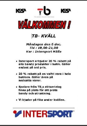 TB- KVÄLL Måndagen den 6 dec. Tid : 19,00-21,00 Var : Intersport Hälla - Intersport erbjuder 20 % rabatt på alla bandy produkter i butik. Gäller endast på ord pris. - 20 % rabatt på en valfri vara i hela butiken. Gäller även på nedsatta varor. - Spelare från TB,s elitserielag finns på plats för att prata bandy och utrustning. - Vi bjuder på fika under kvällen TBsommarbandy 22 nov 2010 0kommentarer